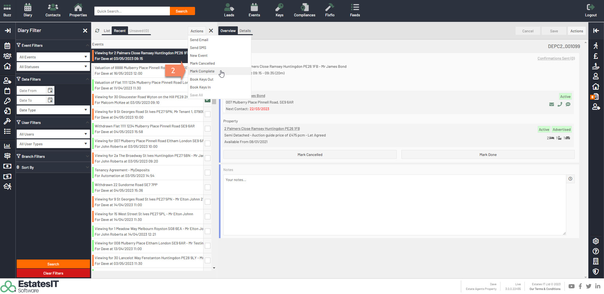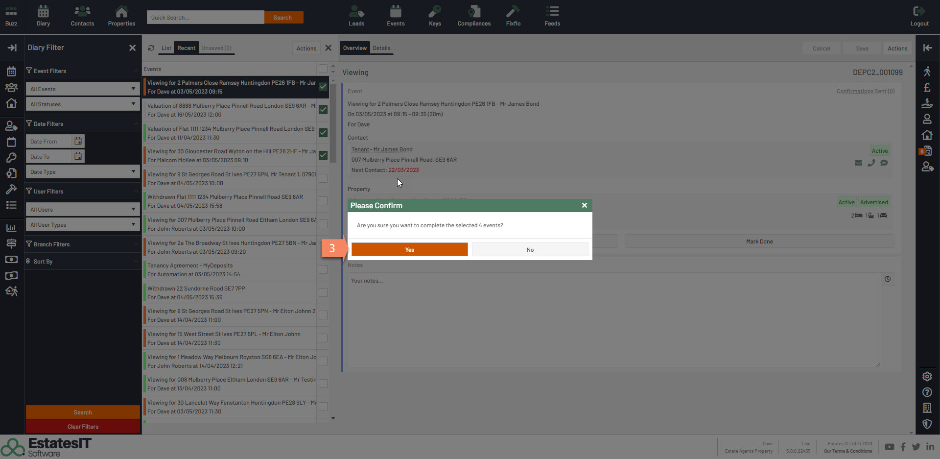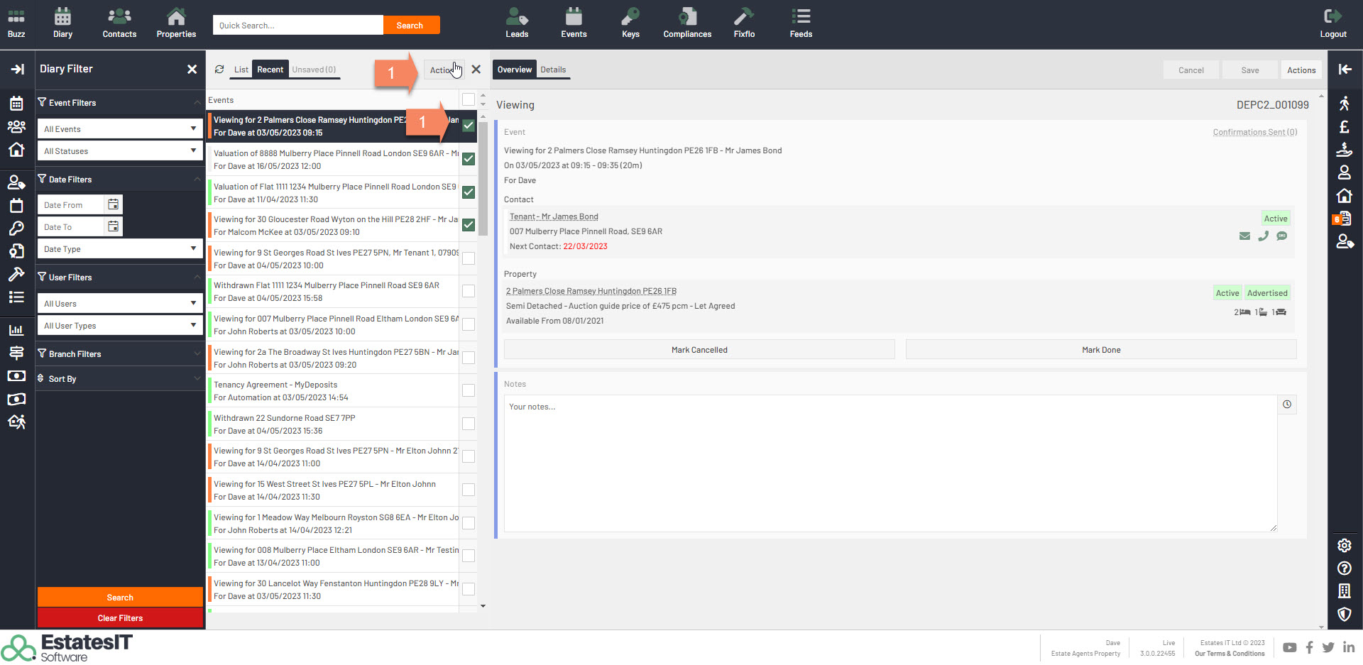 1.Select by ticking which events you would like to complete and then click on the Actions button.
