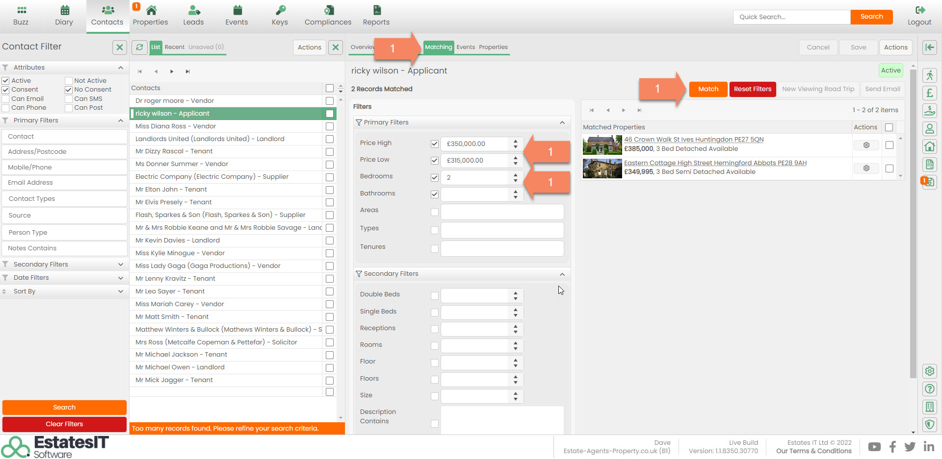 1. If you have either gone to Add Applicant & Match or just on an Applicant record you can change the match requirements which have been set against the Applicant. The software will match against the Price and Bedrooms and Areas (If this is switched on). If you change the requirements you will need to press on Match button. This will re-match to the properties.