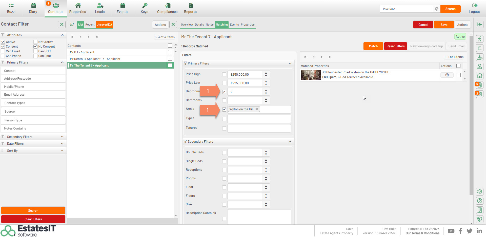 1. If you need to filter on matching you can do this by changing the primary filters. Some of the filters are Price High / Price Low / Bedrooms / Areas / Types. Changing the filtering will narrow down the property search. Click on the tick boxes next to the filter and then click on Match it will then apply this to the matched properties list.
