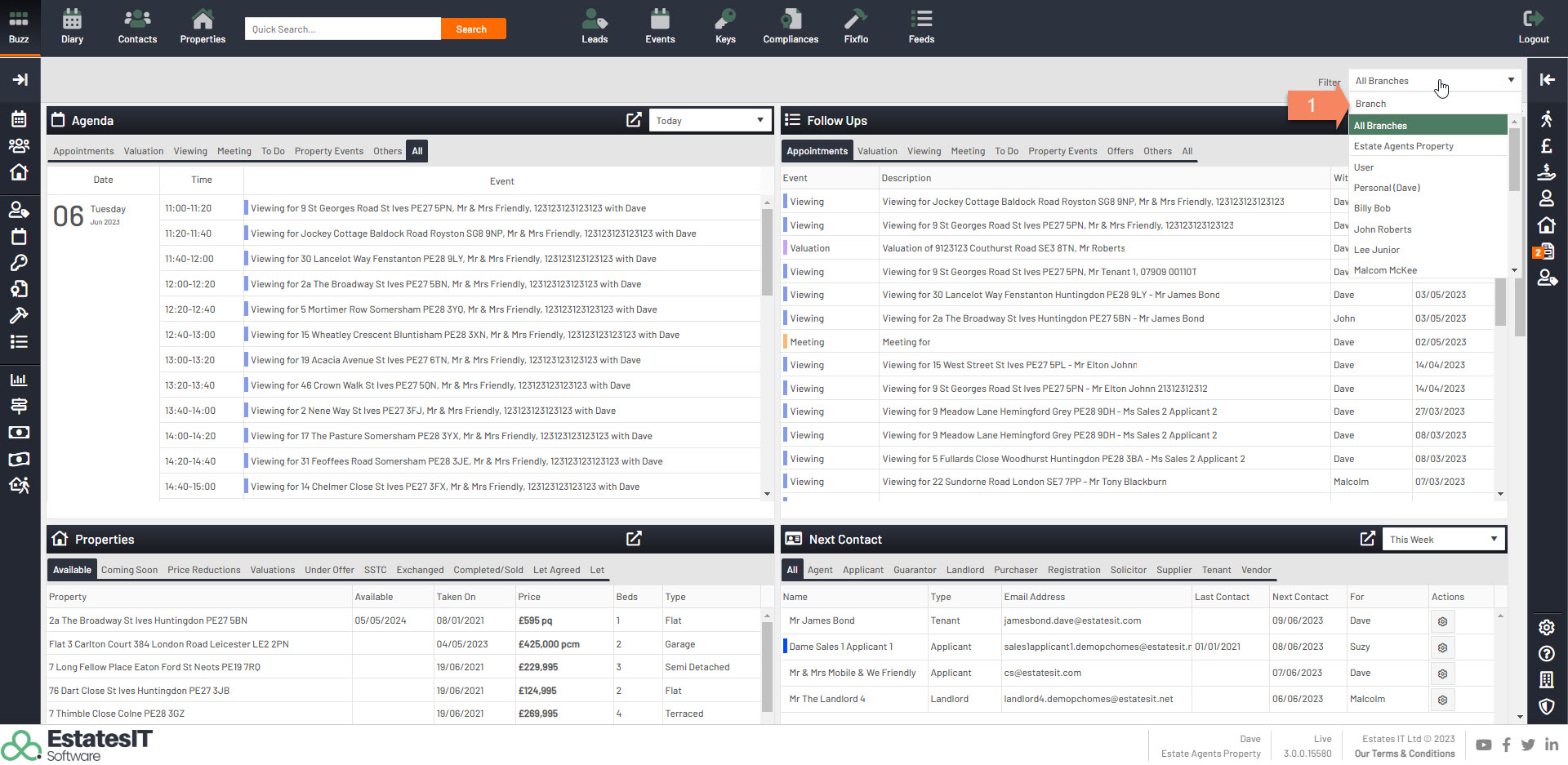 All of the views on the buzz section will show data based on the Filter dropdown. This will save the filter once it is applied. You can filter on Branches/People. Once this has been applied it will change all the buzz sections.