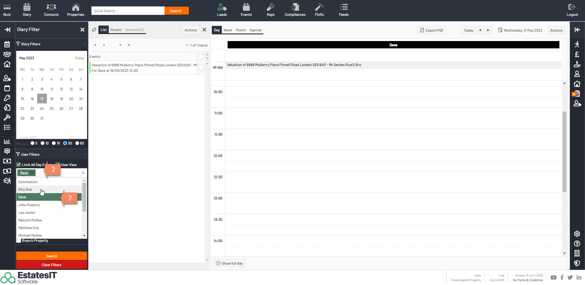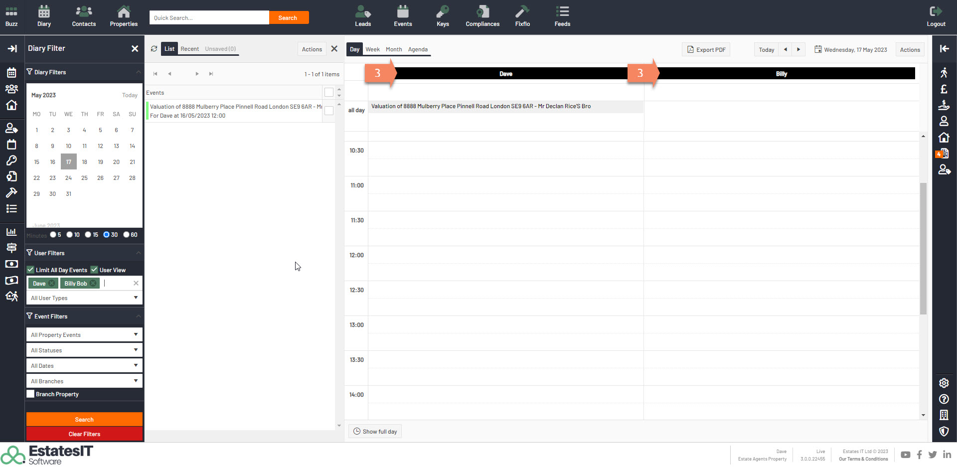 3.Once the user(S) have been added you will see the names at the top of the diary outview window.