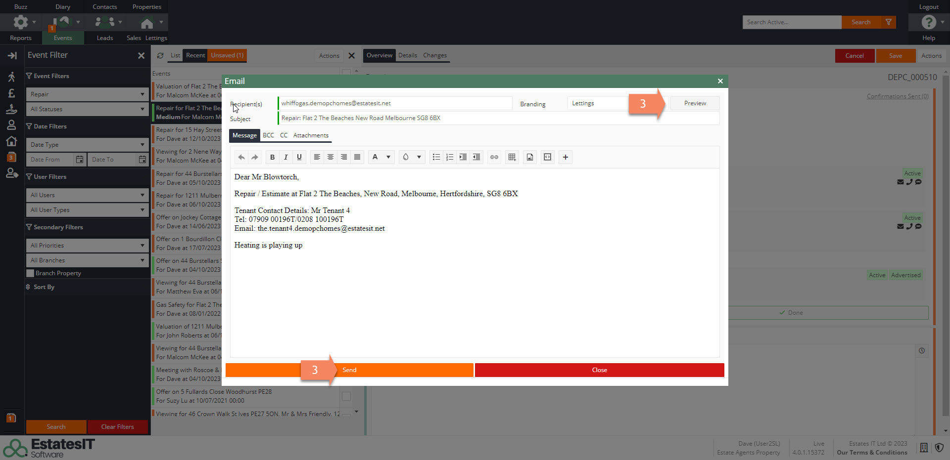 3. If you are happy with the content of the email click on Send. You can preview the email before hand.