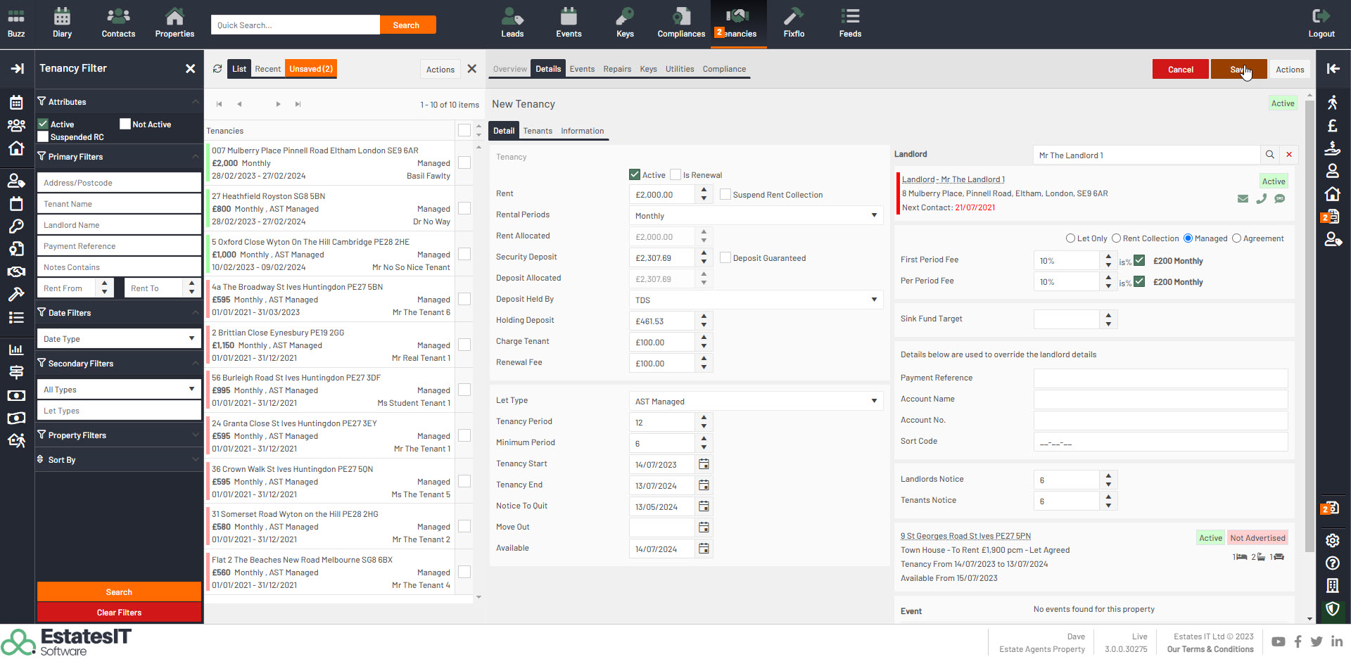 5. Click on Tenancy button to create the Tenancy screen. Then click on Save once you are happy with the information on the Tenancy screen.