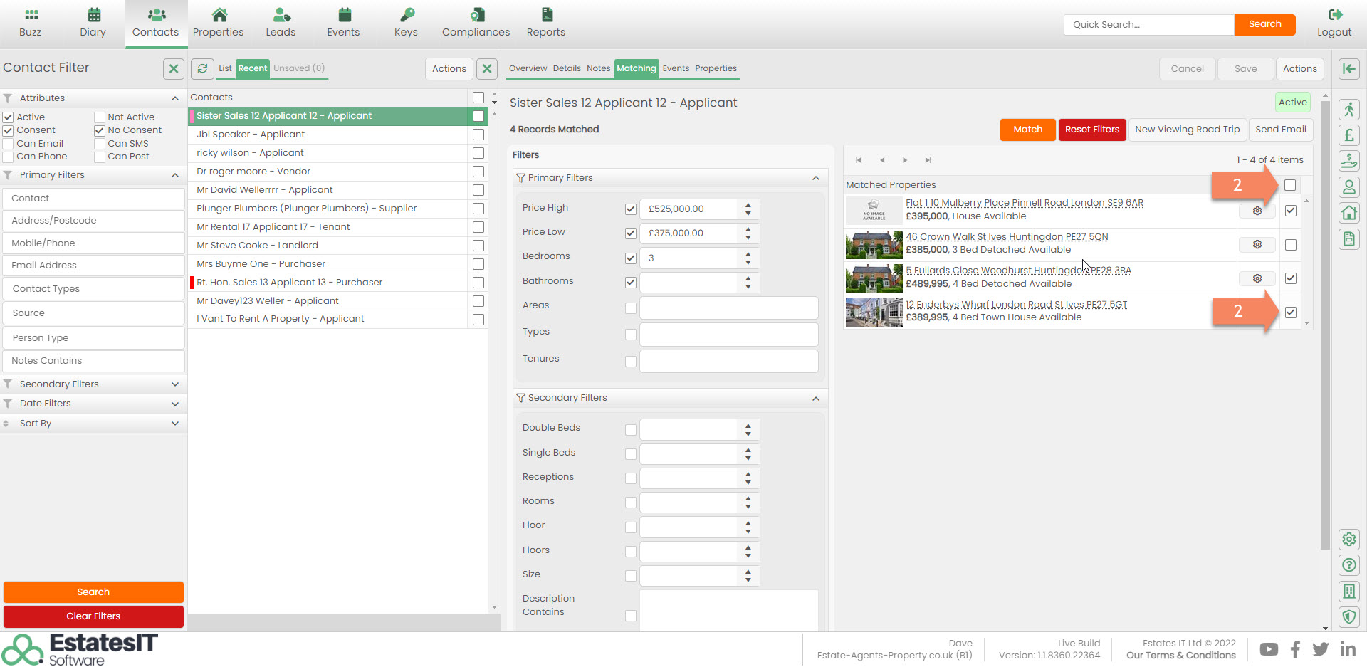 2. Tick the boxes next to the Cog button to select which properties you would like to send to the Applicant. If you want to send the whole match list of properties select the tick box just above them.