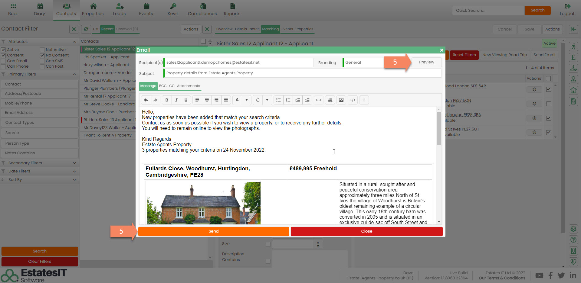 5. Once you click on the template this will open in an edit screen which will allow you to edit the email before you send this. If you would like to see how the email will look click on the Preview button in the top right. If you are happy click on the orange Send button.