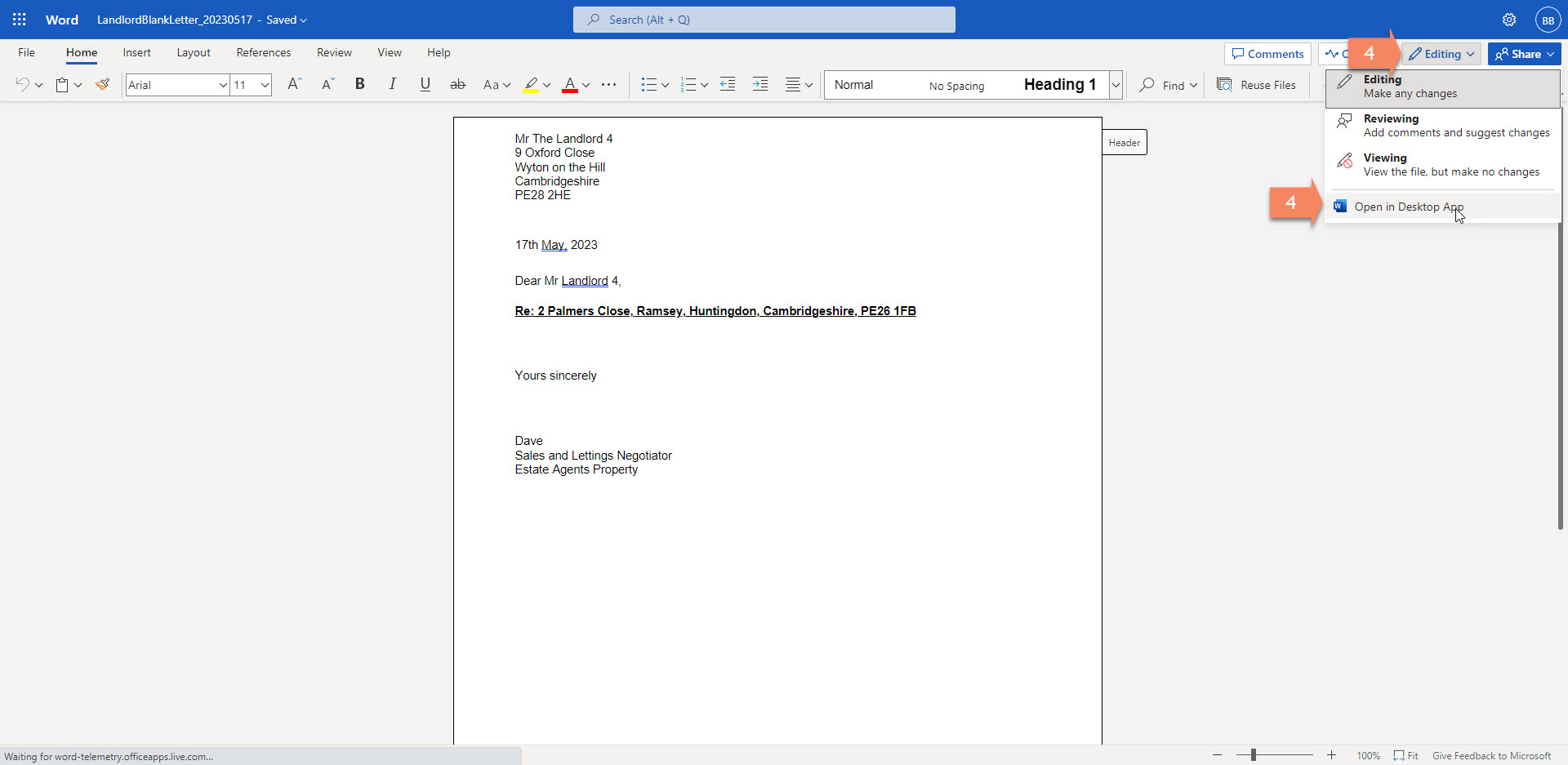 4. The formatting of the letter may not look correct so you can click on Editing on the top menu then click on Open in desktop app.